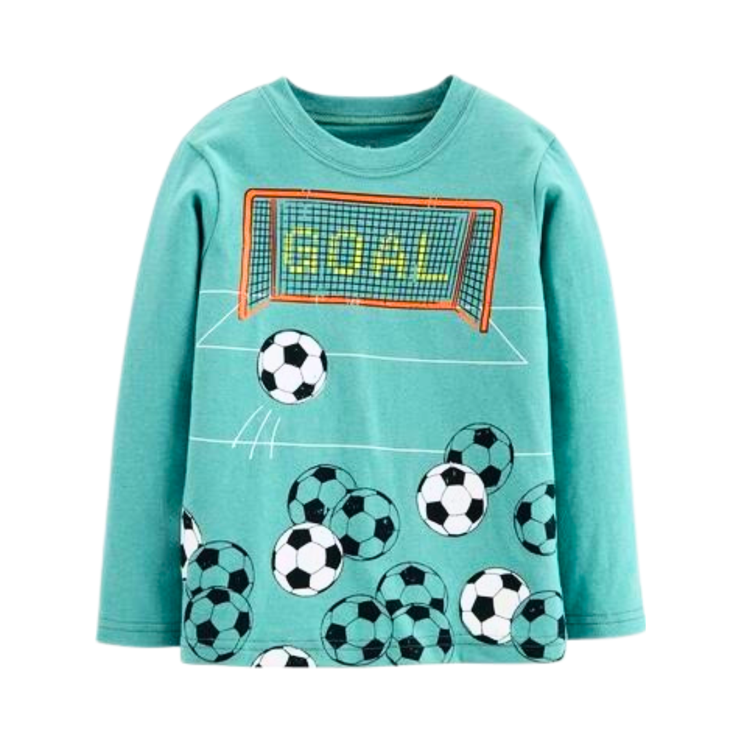 Score big on style and comfort with this fun soccer-themed long sleeve tee for kids. Designed with a bold “GOAL” net graphic and multiple football prints, this shirt is perfect for little sports lovers who enjoy active, energetic looks.