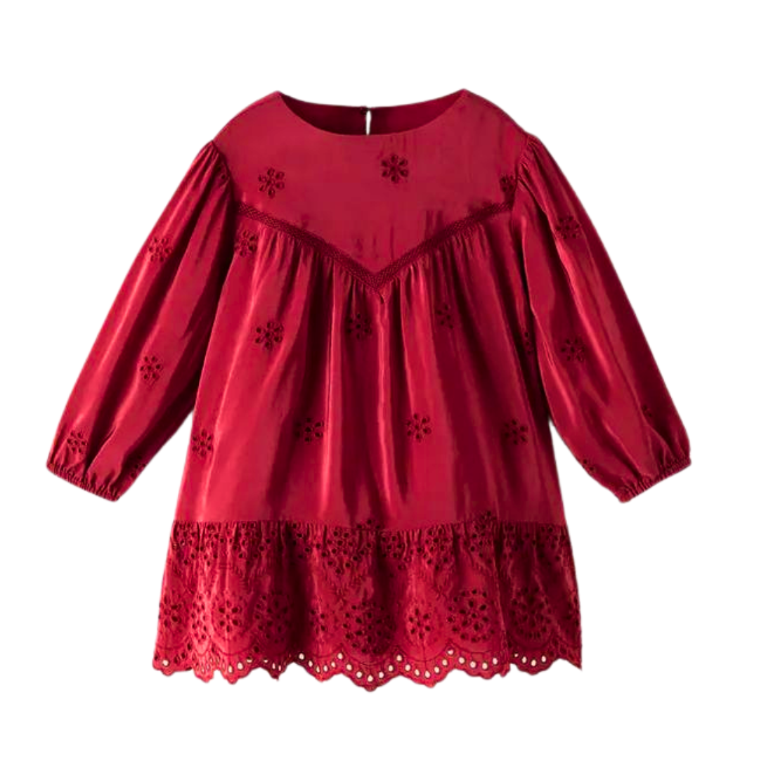Rich in color and full of delicate detail — this maroon tunic top is made to give your little girl a graceful, dressy look with everyday comfort. Designed with subtle floral embroidery throughout, a softly gathered front yoke, and a beautifully cutwork lace hem, this piece blends elegance with playful charm.